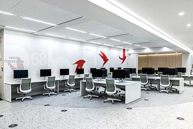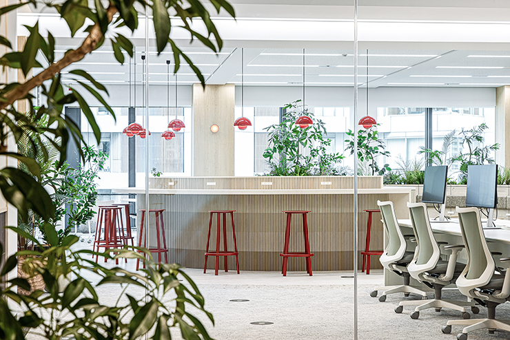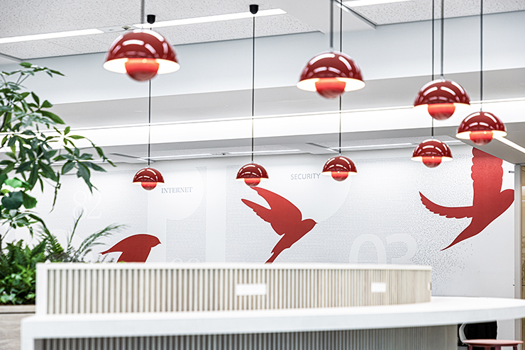 コーポレートカラーで構成された壁面グラフィックとペンダントライトがフォーカルポイント